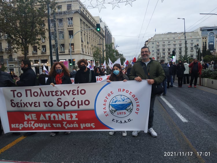 Αντιπροσωπεία του σωματείου μας υλοποιώντας την απόφαση του ΔΣ συμμετείχε στη μεγαλειώδη πορεία για το πολυτεχνείο με το δικό μας μήνυμα ” Το πολυτεχνείο δείχνει το δρόμο, με αγώνες κερδίζουμε τη Ζωή μας”