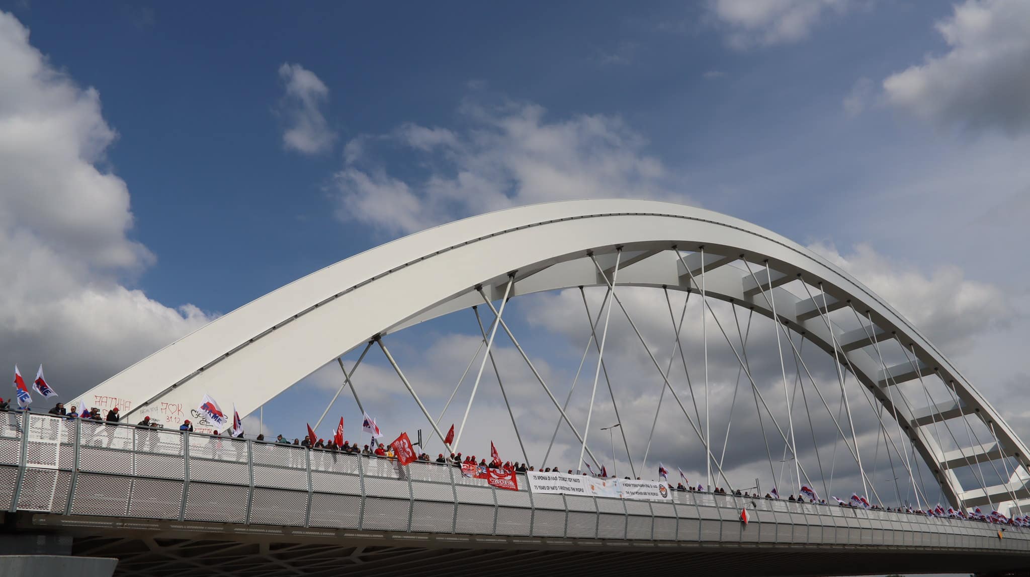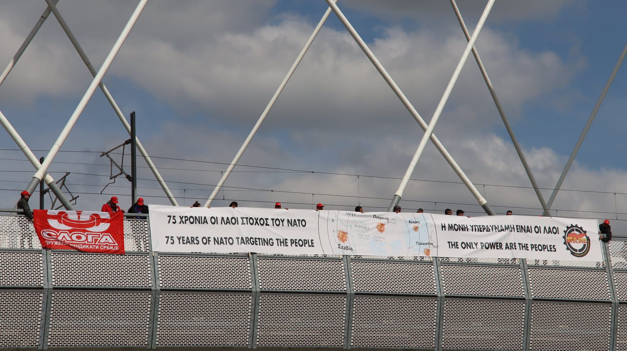 Οι εκατοντάδες εκπρόσωποι των σωματείων ξεδίπλωσαν γιγαντοπανό απλώνοντάς το στη γέφυρα και στέλνοντας το μήνυμα «75 χρόνια το ΝΑΤΟ στοχοποιεί τους λαούς όλου του κόσμου», ότι «Η μόνη υπερδύναμη είναι οι λαοί».